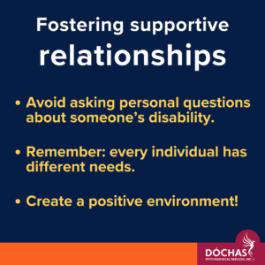 - The emphasis here lies in creating supportive relationships. To do so means creating a positive environment for disabled people to exist in. Be open-minded and accepting of others’ experiences and bear in mind that disabled people are people. Our differences just mean we might need some extra help navigating the world or we may need to do things a little differently – and that’s okay.
