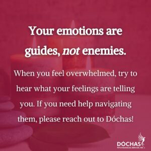 If you are looking for help understanding your emotions, feel free to reach out to Dóchas at 780-446-0300 or info@dochaspsych.com. Book an in-person (Spruce Grove) or virtual (across Alberta) appointment with one of our therapists here.